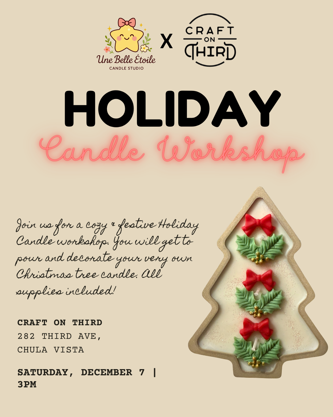 Holiday Candle Workshop Sunday, December 7, 2025 3:00 PM 4:30 PM Craft on Third 282 Third Avenue Chula Vista, CA, 91910 United States (map) Google Calendar ICS