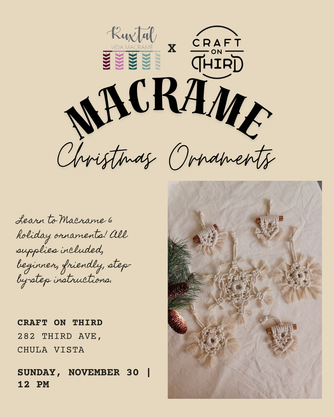 Back to All Events Macramé Christmas Ornaments Sunday, November 30, 2025 12:00 PM 1:30 PM Craft on Third 282 Third Avenue Chula Vista, CA, 91910 United States (map) Google Calendar ICS