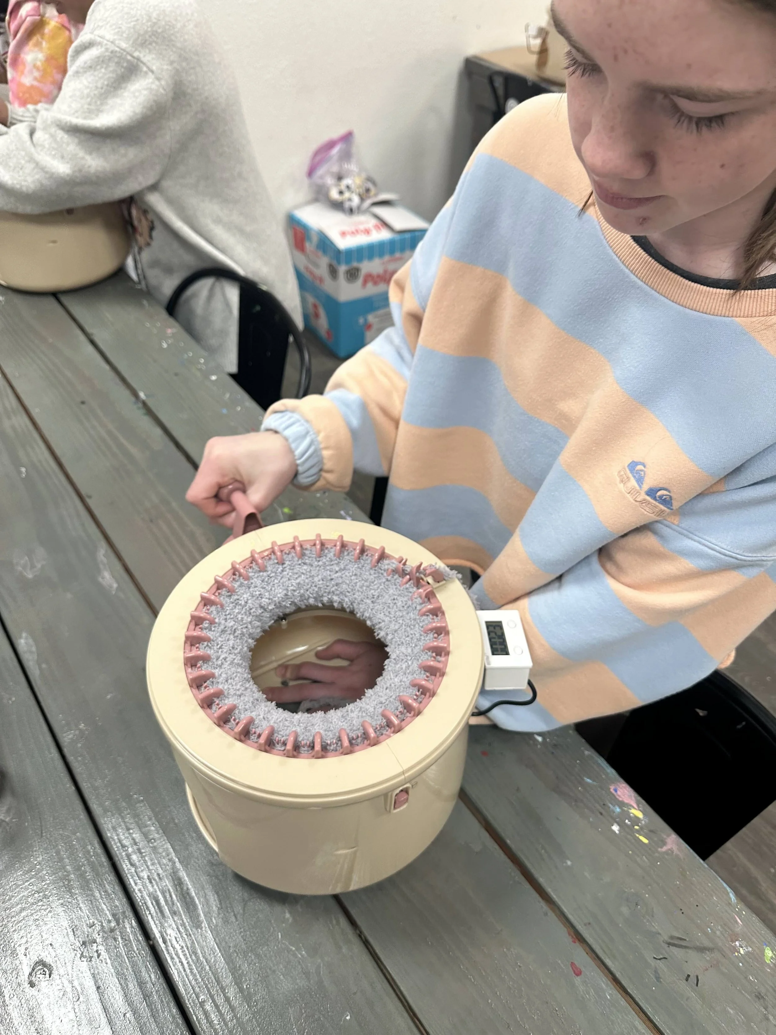 In this work shop you will learn how to use a knitting machine. How to cast on yarn, cast off the tube, stuff it, sew on ears, and add an adorable face.